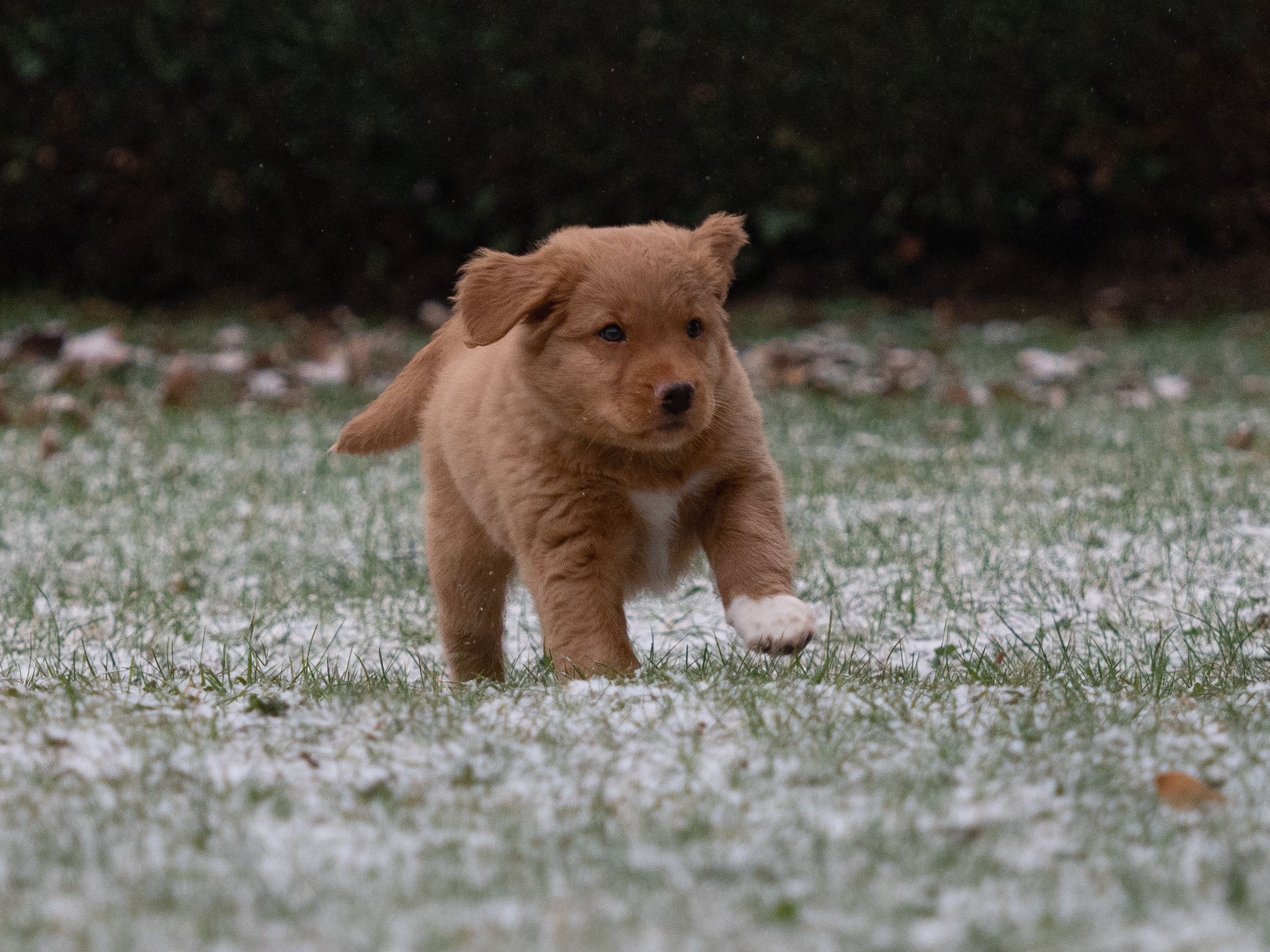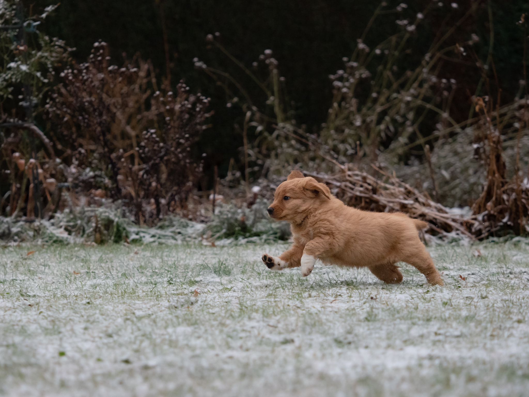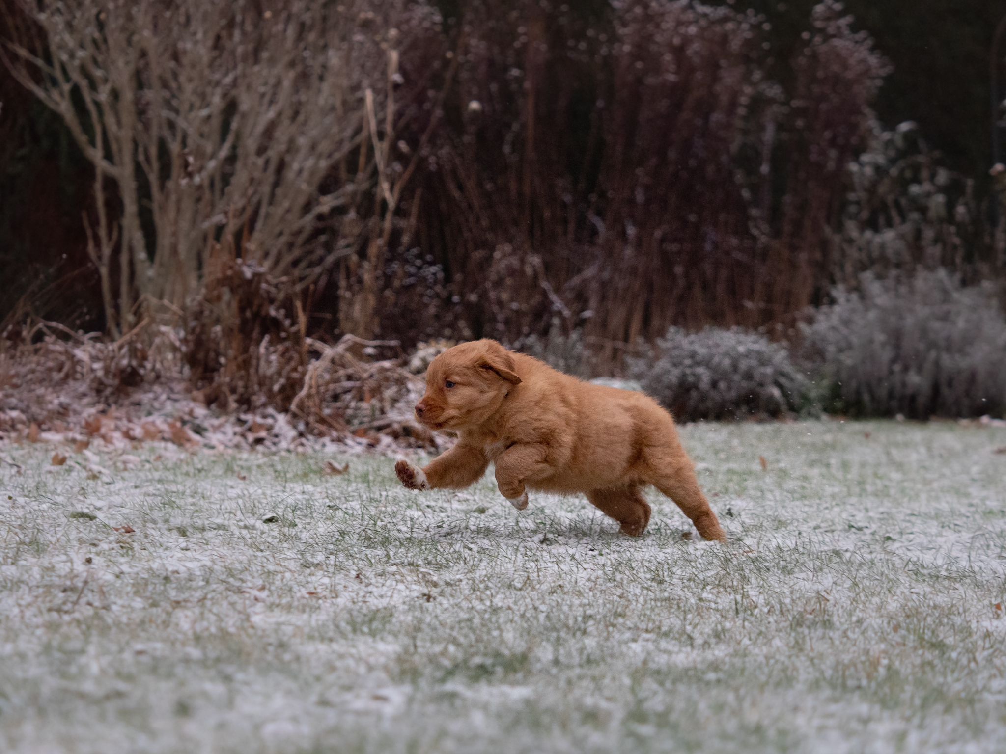 In den Wochen hier bei uns erleben die Welpen sehr viel. Sie genießen von Beginn an Wurfkiste und Welpengehege im Esszimmer und damit mitten in unserem Familienleben. Das garantiert die Gewöhnung an viele Alltagsgeräusche und Reize, aber auch die Ruhe kommt nicht zu kurz, denn die Zwerge benötigen viel Schlaf um all das Erlebte zu verarbeiten. Ab der 4. Woche gab es die ersten Besuche und bei günstiger Witterung ging es immer wieder für kurze Zeit ins Außengehege, im Januar sogar mit Schnee! Auch beim Weihnachtsfest waren die Zwerge mittendrin.