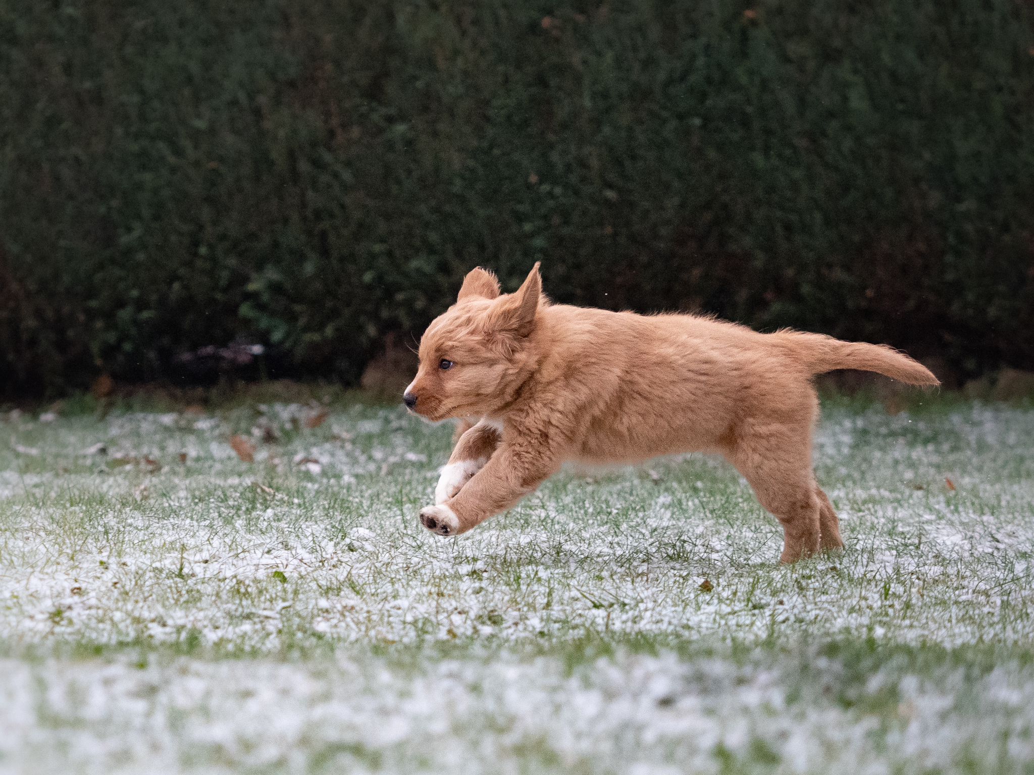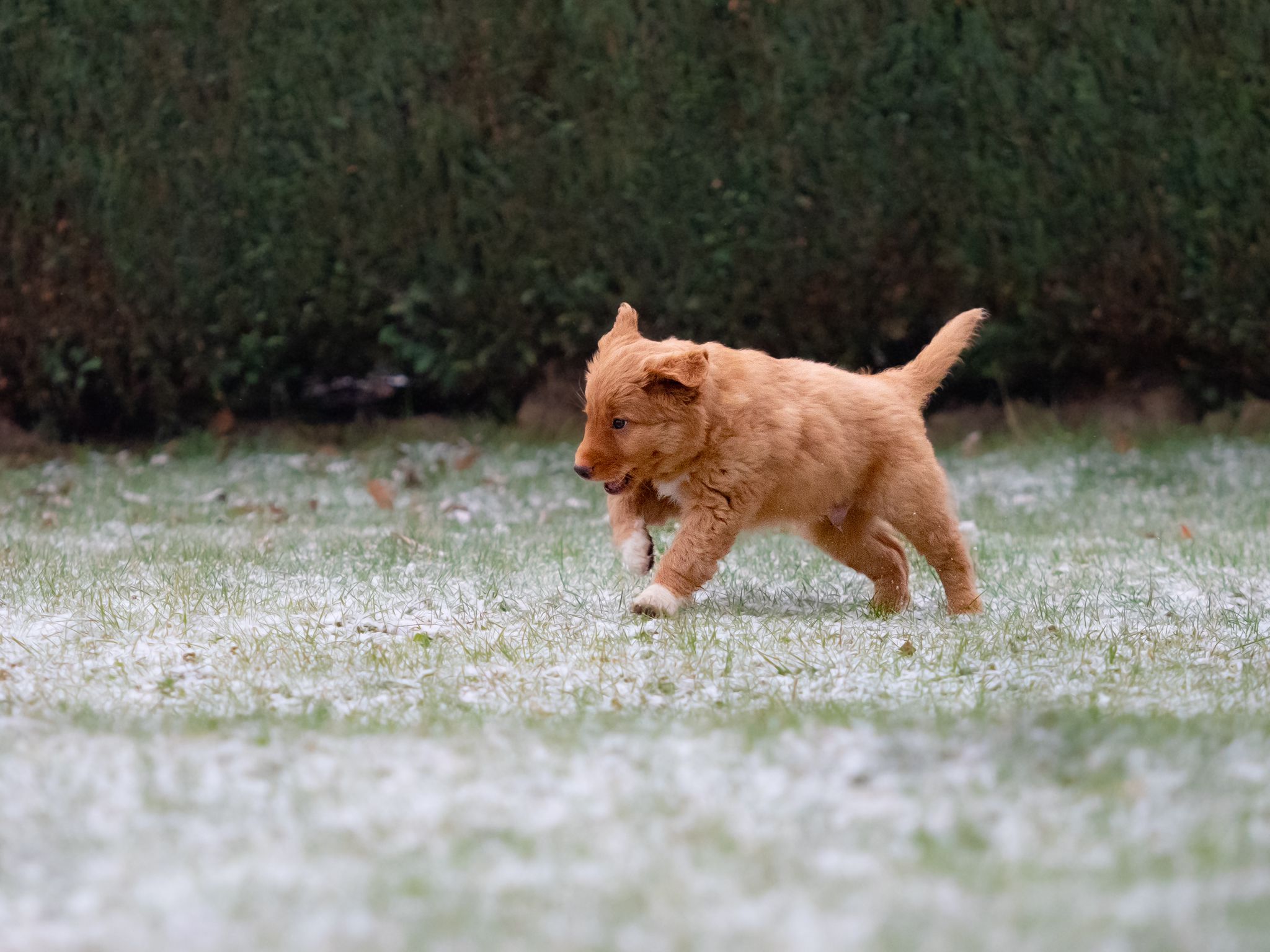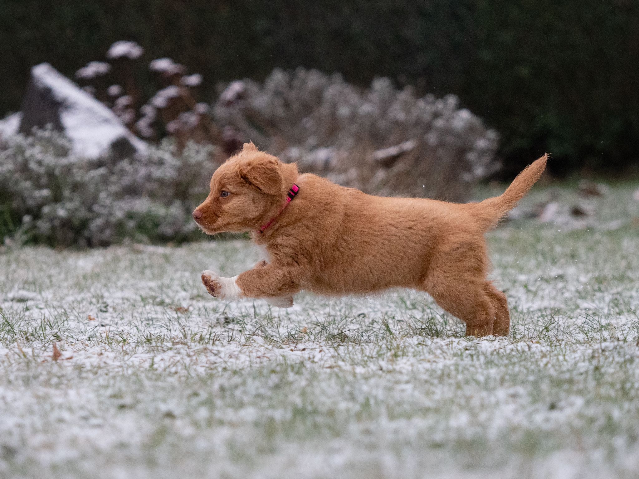 In den Wochen hier bei uns erleben die Welpen sehr viel. Sie genießen von Beginn an Wurfkiste und Welpengehege im Esszimmer und damit mitten in unserem Familienleben. Das garantiert die Gewöhnung an viele Alltagsgeräusche und Reize, aber auch die Ruhe kommt nicht zu kurz, denn die Zwerge benötigen viel Schlaf um all das Erlebte zu verarbeiten. Ab der 4. Woche gab es die ersten Besuche und bei günstiger Witterung ging es immer wieder für kurze Zeit ins Außengehege, im Januar sogar mit Schnee! Auch beim Weihnachtsfest waren die Zwerge mittendrin.